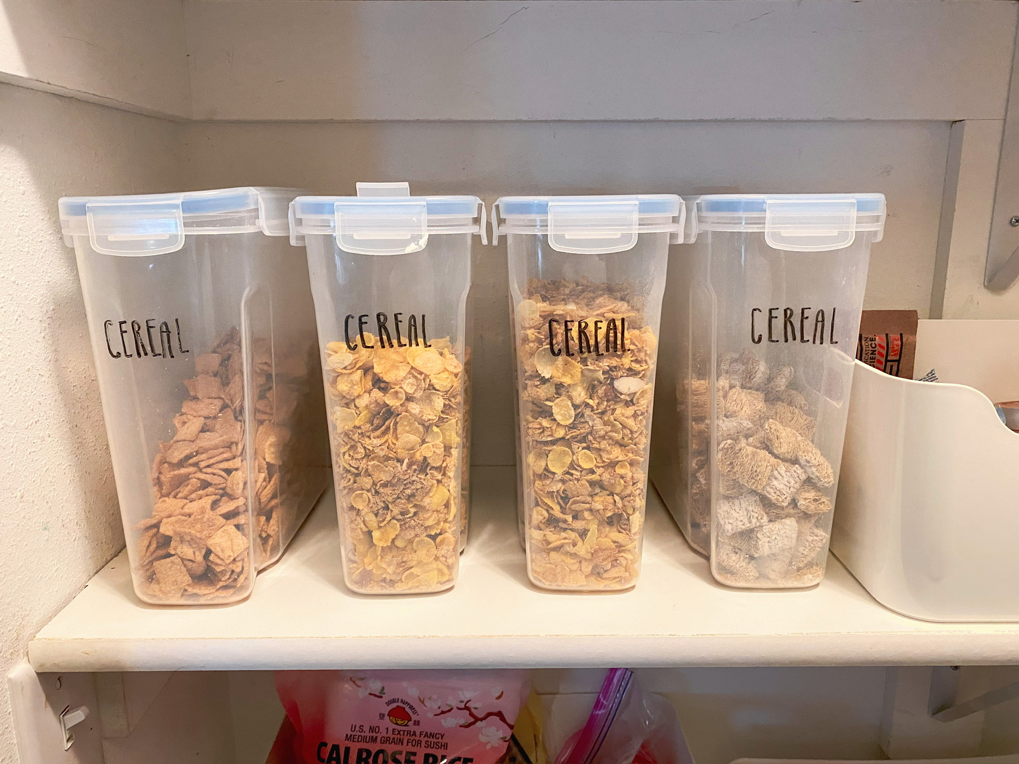 Clear containers are one of our favorite ways to bring calm into the busiest part of the day. As you can see on this shelf, storing cereal in clear, matching, containers provides instant clarity.
