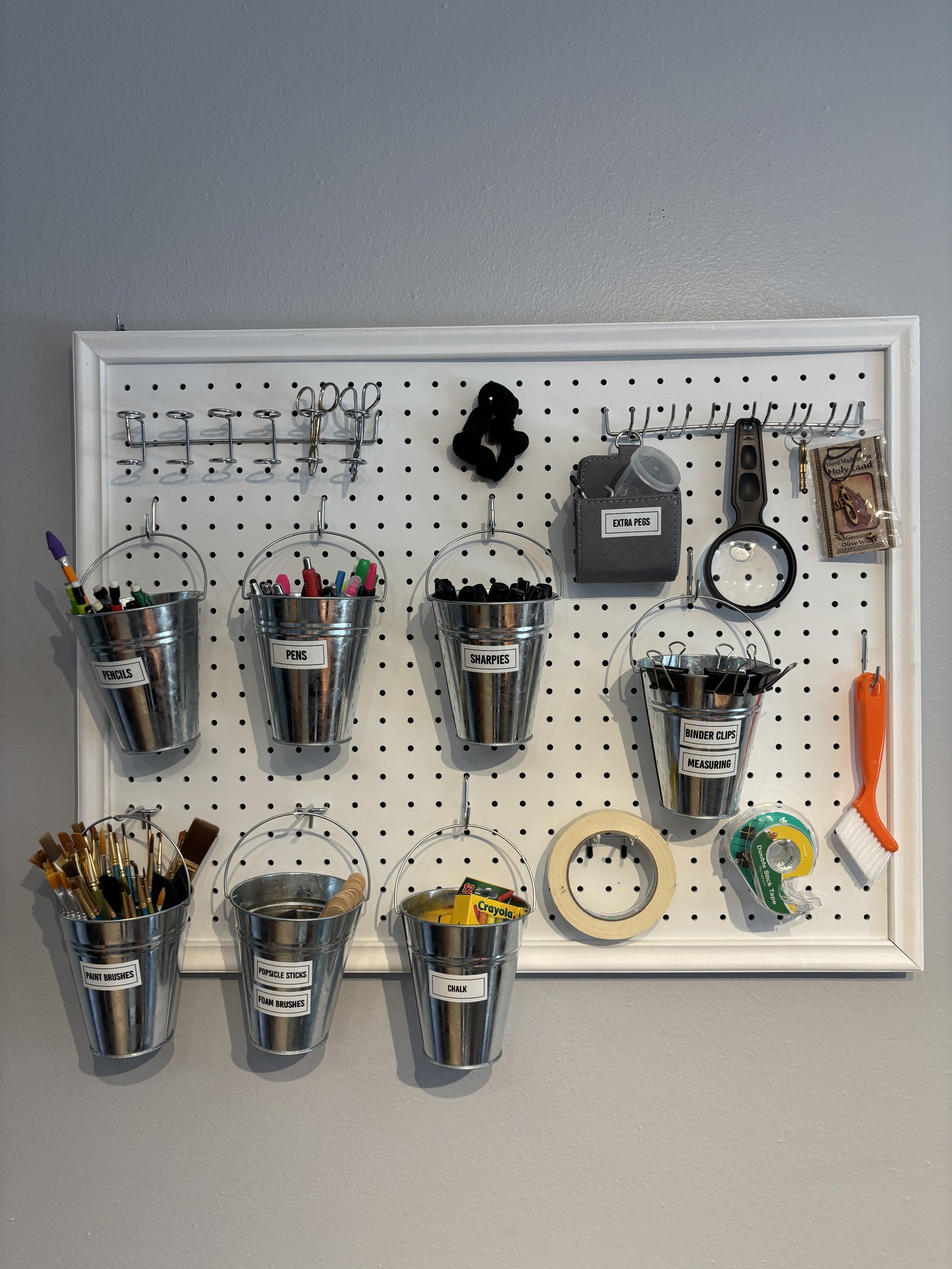 This pegboard keeps all of the artist’s everyday tools in one clean, easy-to-reach spot. Scissors, rulers, blades, and small supplies now have simple labeled homes, making the whole space feel calmer and easier to work in. It’s a small system that makes a big difference in keeping creativity flowing.